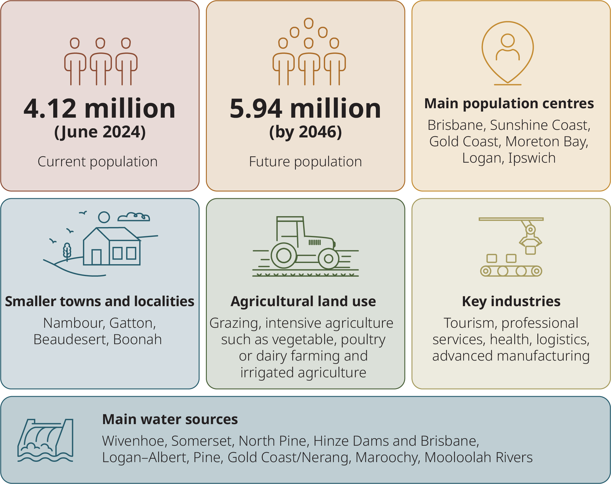 The South East Queensland Agriculture Regional Water Assessment (SEQ Ag RWA) area spans a diverse and rapidly growing part of Queensland that includes the major population centres of Brisbane, Ipswich, Logan, the Sunshine Coast, and the Gold Coast, as well as surrounding rural areas such as the Lockyer Valley, Scenic Rim, Somerset, Southern Downs, and Moreton Bay regions.